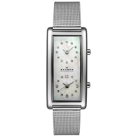 Keep time coast-to-coast with this slim, sleek women's watch with signature Skagen mesh bands. The rectangular silver case is home to a white Mother-of-Pearl dial with dual time zone-function, with the bottom movement featuring a second hand.
